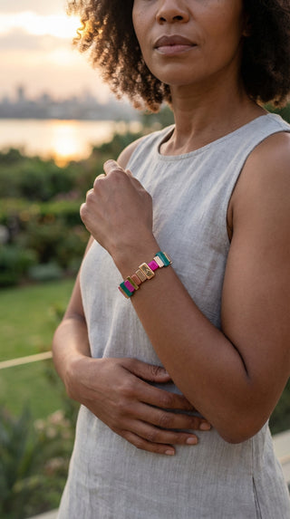Each piece brings its own tone and texture, but stacking them creates something deeper. Soft colours blend, gold catches the light, and your wrist tells a quiet story of warmth and style.